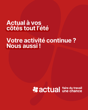 Spécialiste du travail intérimaire, du recrutement, de l'accompagnement et de la formation depuis plus de 30 ans, Actual est aujourd'hui le leader indépendant sur le marché du travail et de l'emploi en France. Avec plus de 400 agences réparties sur le territoire, Actual accompagne chaque année 60 000 hommes et femmes dans leur parcours professionnel en leur proposant des solutions adaptées à leur projet (Intérim, CDI intérim, CDI, CDD, formation...). Vous recherchez un emploi ? Vous avez un projet de recrutement pour votre société ? L'ensemble de nos conseillers Actual se mobilise au quotidien pour répondre à votre besoin.